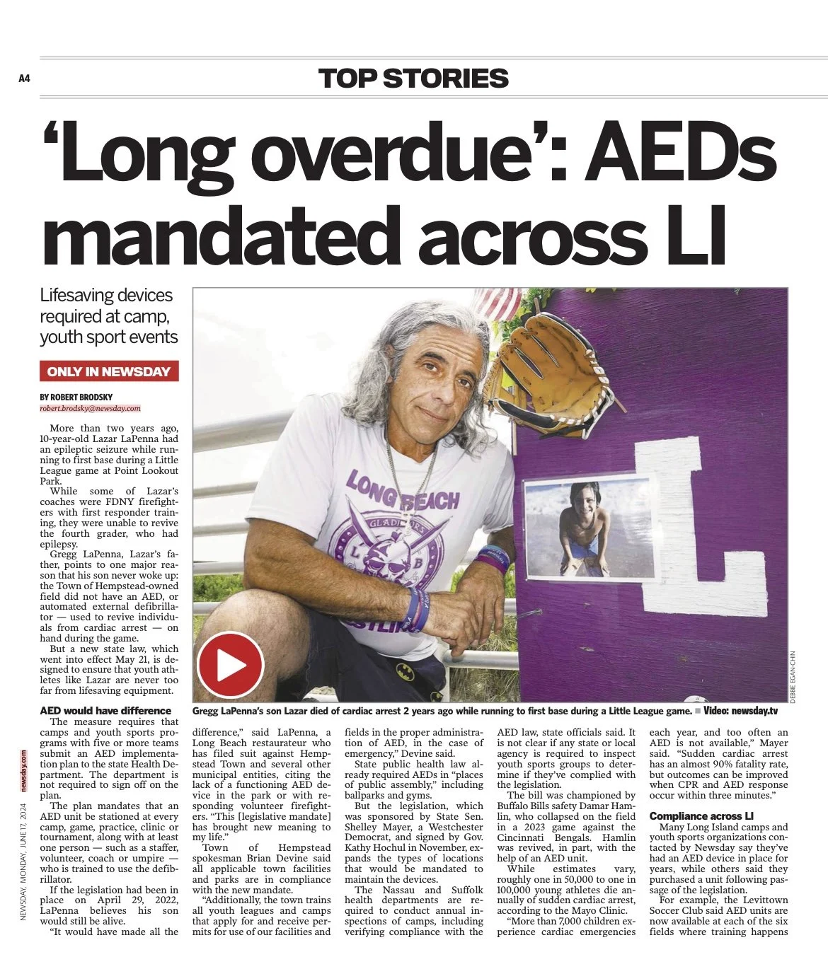 IN THE PRESS COURTESY OF CBS NEWS https://www.cbsnews.com/newyork/news/new-york-law-requires-aeds-at-youth-sports-summer-camps/ COURTESY OF NEWSDAY LI COURTESY OF TOTALPROSPORTS.COMhttps://www.totalprosports.com/ncaa/baseball/little-league-baseball-player-tragically-dies-at-age-10-during-game/ COURTESY OF NEWS 12 LI https://longisland.news12.com/brothers-seek-to-honor-long-beach-little-leaguers-legacy-with-t-shirtshttp://longisland.news12.com/long-islanders-wear-little-league-jerseys-to-school-in-honor-of-lazar-lapennaCOURTESY NEWSDAY LIhttps://www.newsday.com/opinion/commentary/guest-essays/epilepsy-lazar-lapenna-lido-beach-gwk1leoahttps://www.newsday.com/long-island/lazar-lapenna-little-league-jersey-pay-tribute-ni9li8qy
